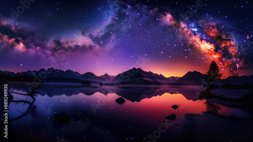 Naklejka premium Panoramic Night Sky View Featuring Milky Way Galaxy, Mountain Silhouettes, Reflective River, and Pine Tree