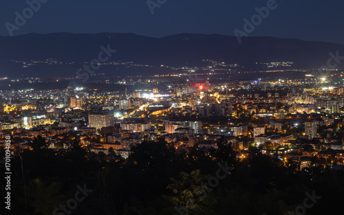 © Laurentiu Bratu, Obraz premium panoramic night view of a sprawling cityscape, with the illuminated buildings and streets of Skopje nestled against the backdrop of mountains