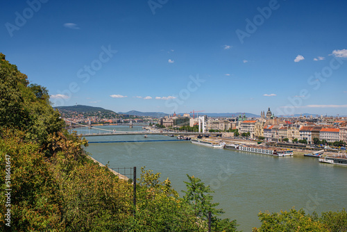 Fototapeta premium Panoramic night view of Budapest from Gellert Hill. Danube River, Chain Bridge, Buda and Pest views. Budapest