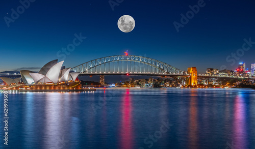 Fototapeta premium Panoramic night view of Sydney Harbour and CBD buildings on the foreshore in...