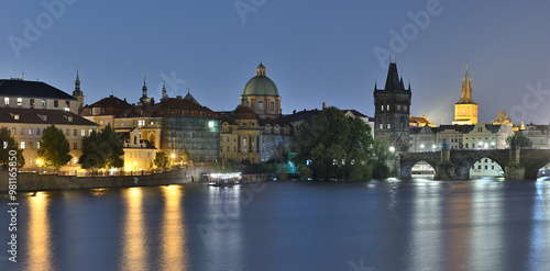 Naklejka premium Panoramic night view of the iconic Charles Bridge over Vltava river and...