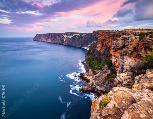 © coconut, Fototapeta premium Panoramic ocean view of cliffs and a gorgeous sunset