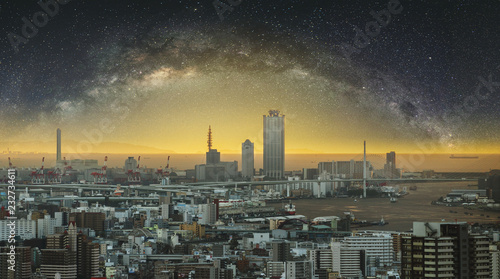 Obraz premium Panoramic Osaka city at dawn with starry sky