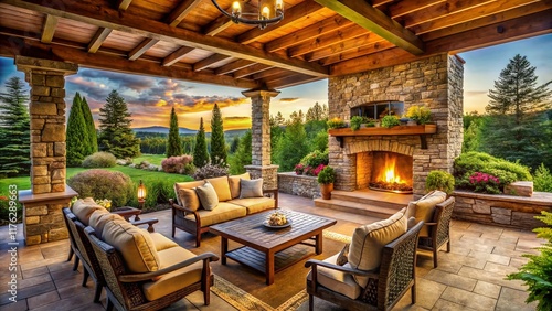 Naklejka premium Panoramic Outdoor Living Space: Stone Fireplace, Wooden Furniture, Pergola