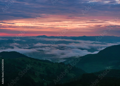 © Viktoria, Obraz premium Panoramic photo of Mountain range through the morning colorful fog in the summer. Beautiful sunrise in the Carpathian Mountains with visible silhouettes and pink clouds in the sun rays.