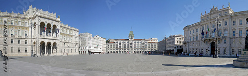 © birdiegal, Obraz premium Panoramic photo of Piazza Unita di Italia (Unity of Italy Square) Large square in Trieste, Italy. A seaport city in northeast Italy. Unrecognizable people / tourists
