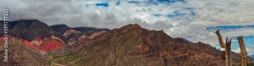 Fototapeta premium Panoramic photo of the landscape view from archaeological monument at Pucara of Tilcara - old pre inca ruins - Jujuy, Argentina. Quebrada de Humahuaca