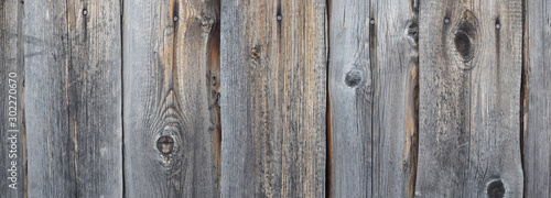 Fototapeta premium Panoramic picture of a natural grey wooden texture with knots and nail heads....