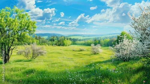 © savittree, Obraz premium Panoramic rural landscape with hay bales in a field at summer sunset