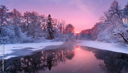 © soyibakter, Naklejka premium Panoramic russian winter landscape with forest beautiful frozen river at sunset scenery with winter trees water and blue sky at twilight frosty snowy river snow