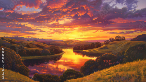 © Lily, Naklejka premium Panoramic Serenity: Sunset Over Rolling Hills and Tranquil River