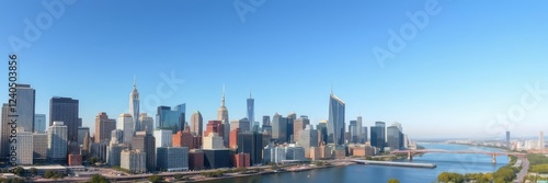 © Prasert, Fototapeta premium Panoramic shot of a city with numerous skyscrapers and a river in the foreground under clear blue skies, panoramic view, tall buildings