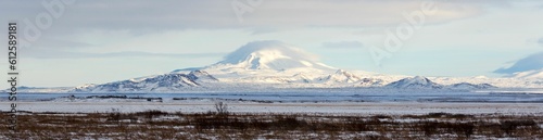 Obraz premium Panoramic shot of a mountain covered with snow under the blue sky and clouds