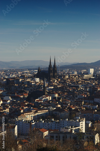 © Frederic Hodiesne, Naklejka premium panoramic shot of the city of Clermont-Ferrand and the Notre Dame de l'Assomption Cathedral, in black volcanic stone. Auvergne, Puy-de-Dome, France