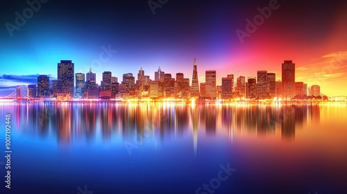 © sa-photo, Fototapeta premium Panoramic shot of the San Francisco skyline with skyscrapers, the Golden Gate Bridge, and the calm waters of the bay reflecting the city lights.