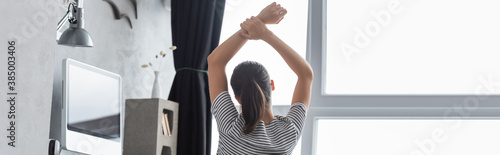 Fototapeta premium Panoramic shot of woman looking at window while sitting near computer at home