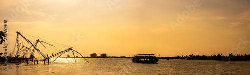 © yotrakbutda, Fototapeta premium Panoramic silhouette of chinese fishnets on sunset at Fort Kochi, Kerala, India.
