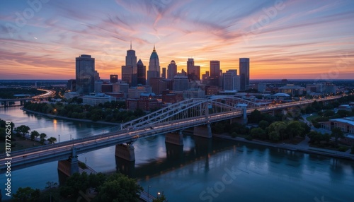 © Ning, Fototapeta premium Panoramic skyline featuring the vibrant architectural landscape at sunset
