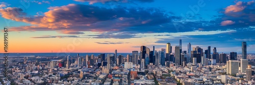 Obraz premium Panoramic Skyline of a Vibrant Modern City at Sunrise