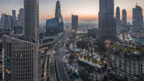 Fototapeta premium Panoramic skyline view of Dubai downtown before sunrise with mall, fountains and skyscrapers aerial night to day timelapse