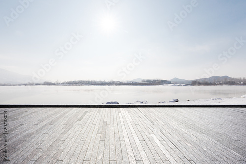 © zhu difeng, Naklejka premium Panoramic skyline with empty concrete square floor