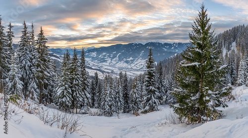 © Mia, Fototapeta premium Panoramic Snow Covered Mountain Range at Sunrise