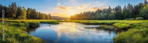 © Valeh, Fototapeta premium Panoramic summer river view with lush greenery and sunset reflections. AI generated illustration