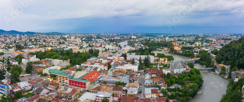 © miklyxa, Fototapeta premium Panoramic summer view of the city of Kutaisi, Georgia. Blue sky with clouds. River Rioni and old houses with Red roofs. Mountains in the distance.