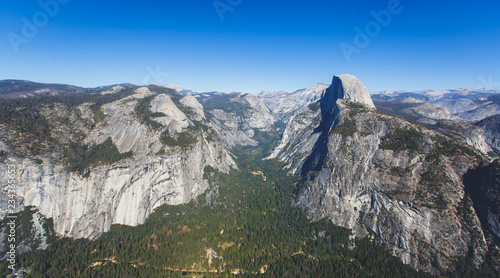 Fototapeta premium Panoramic summer view of Yosemite valley with Half Dome mountain, Tenaya Canyon, Liberty Cap, Vernal Fall and Nevada Fall, seen from Glacier point overlook, Yosemite National Park, California