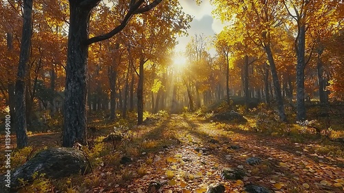 © Aqeel Siddique, Fototapeta premium Panoramic sunny forest in autumn 16k resolution.