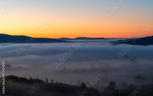 © Monisha, Fototapeta premium Panoramic Sunrise Landscape Misty Mountains and Valley
