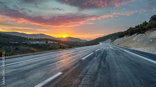 Fototapeta premium Panoramic sunrise view of an asphalt highway with natural mountain scenery,...