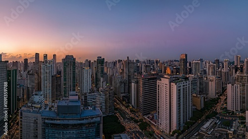 © sobartea, Fototapeta premium Panoramic sunset view of a dense cityscape with skyscrapers and roads.