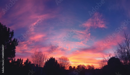 © afia, Fototapeta premium Panoramic sunset view with vibrant pink and orange clouds over silhouettes of trees