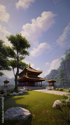 Obraz premium Panoramic temple landscape with scenic park and sky clouds