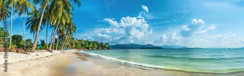 © gen_pick, Fototapeta premium Panoramic Tropical Beach with Palm Trees and Blue Sea