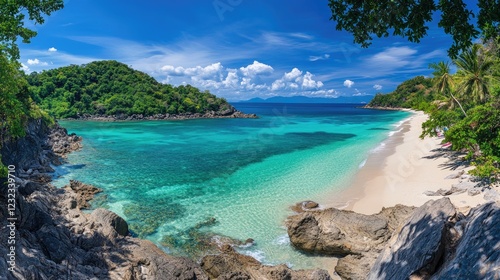 © samrit, Fototapeta premium Panoramic tropical beach with turquoise sea, bright white sand, and swaying palm trees under a sunny blue sky