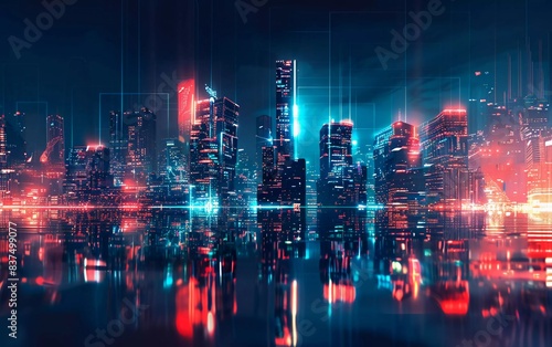 Fototapeta premium Panoramic urban architecture, cityscape with space and neon light effects....
