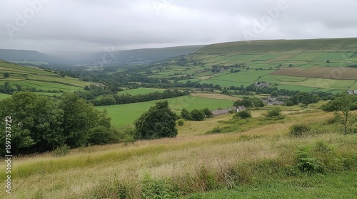 Obraz premium Panoramic valley view, green fields, and hills