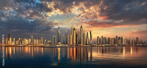 Fototapeta premium Panoramic view capturing the Dubai Marina skyline, reflecting beautifully on water at sunset, surrounded by dramatic clouds and vibrant colors