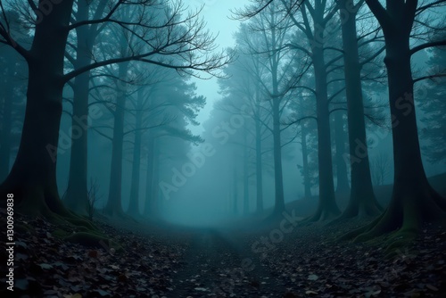 Obraz premium Panoramic view, dark forest, swirling mist, Halloween feel, fantasy, creepy