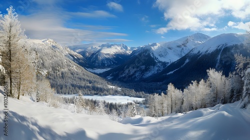 © Gendar SINURO, Obraz premium Panoramic view down snow covered valley in alpine mountain range