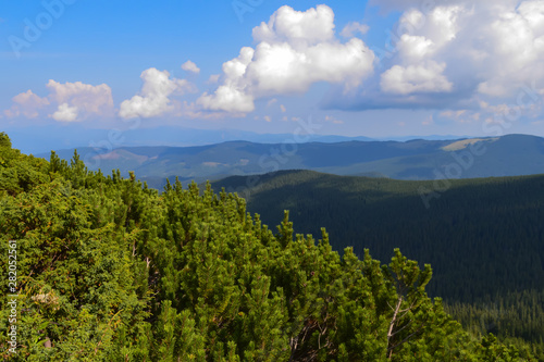 Fototapeta premium Panoramic view from Hoverla, Carpathian mountains, Ukraine. Horizontal outdoors shot