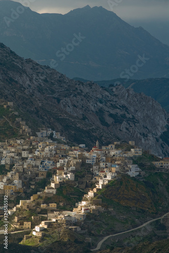 © hectorchristiaen, Obraz premium Panoramic view from mount Profitis Ilias over the village of Olympos in the island of Karpathos in Greece