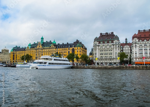 Naklejka premium Panoramic view from the tourist excursion boat to the pier with boats and the beautiful buildings of Stromkayen in the center of Stockholm Sweden