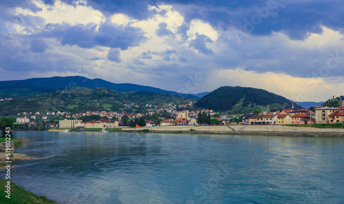 Fototapeta premium Panoramic View in the Rainy Day to the Višegrad with the Rainbow over the Drina River, Bosnia and Herzegovina