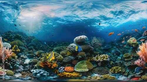 Fototapeta premium Panoramic view of a bustling marine ecosystem with coral and fish
