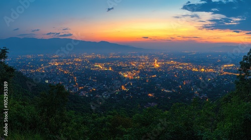 © BloomArt, Obraz premium Panoramic view of a city at sunset, with distant mountains and a hazy sky.