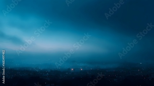 © Thares2020, Naklejka premium Panoramic view of a city emerging from dense mist and fog at the tranquil blue hour with faint glowing lights illuminating the landscape
