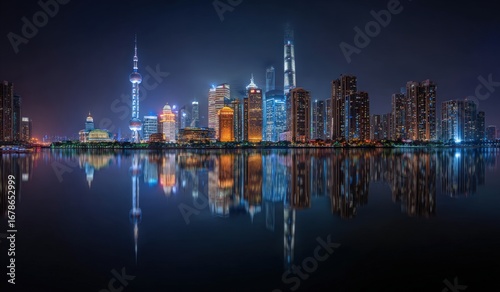 © pedro, Fototapeta premium Panoramic view of a city skyline at night, reflected in a calm river